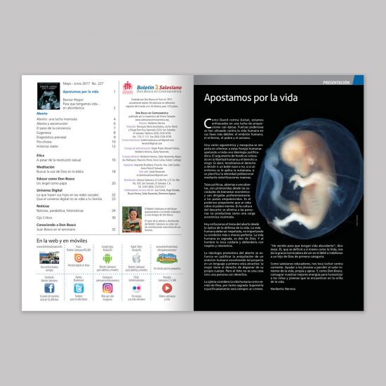 Desde el año 2000, tenemos a cargo la producción de la revista Boletín Salesiano Don Bosco en Centroamérica de la Inspectoría Salesiana en la región. Durante esos años se han realizado 3 diferentes diseños renovando la revista, creando la versión web y la versión App para móviles.